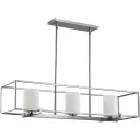 The Chadwick linear chandelier combines modern clean lines with transitional appeal through its etched opal glass shades and brushed nickel finish. Three lights provide balanced illumination perfect for dining areas and kitchen islands.