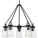 The Stockbrace chandelier combines rustic farmhouse charm with modern industrial design. Five clear glass shades on a black metal frame create a striking focal point perfect for dining spaces and kitchen islands.