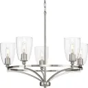 The Parkhurst chandelier blends farmhouse charm with modern sophistication through its brushed nickel finish and clear glass shades. Five lights provide ample illumination while the transitional design adapts to various interior styles.