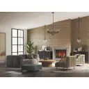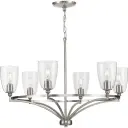 The Parkhurst chandelier combines transitional styling with farmhouse charm, featuring six lights and clear glass shades in a brushed nickel finish. Its versatile design works beautifully in dining rooms, kitchens, and bedrooms.