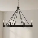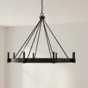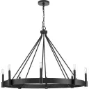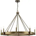 The Breckenridge eight-light chandelier blends modern clean lines with rustic farmhouse charm. Its aged bronze finish and substantial presence make it perfect for large dining rooms and great rooms seeking a sophisticated yet approachable aesthetic.