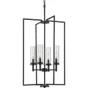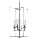 The Kellwyn four-light pendant combines timeless clear glass with brushed nickel finish for versatile transitional style. Perfect for foyers and dining rooms, it provides ample illumination while maintaining an open, airy aesthetic.