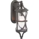The Morrison wall lantern brings traditional charm to compact outdoor spaces with its antique bronze finish and clear glass panels. Perfect for flanking doorways or illuminating smaller porches and patios.