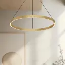 The Cerchio pendant combines architectural elegance with functional illumination. Its extruded aluminum rectangular profile and brushed gold finish create a refined statement, while integrated LED technology provides warm ambient and task lighting.