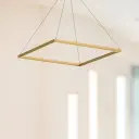 The Piazza 36-inch pendant combines clean architectural lines with warm LED lighting. Its extruded aluminum construction and brushed gold finish create a sophisticated focal point over dining tables and kitchen islands.