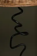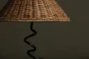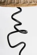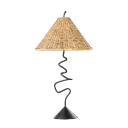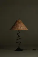 The Alaric Table Lamp combines forged iron craftsmanship with natural rattan in a playful yet sophisticated sculptural form. Its twisted stem creates visual interest while the tapered shade provides warm, diffused lighting.