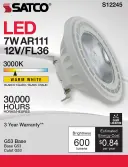 7 Watt - AR111 - COB LED - 600 Lumens - G53 Base - 80 CRI - 3000K - 12 Volt - 36 Degree - Floodlight Bulb