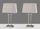 The Camila table lamp set delivers contemporary style with brushed steel open rectangular frames and grey-white woven fabric shades. At 24.25" height, this matching pair creates cohesive symmetry for bedside tables or console styling.