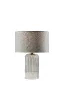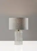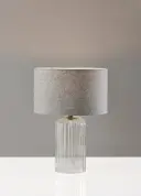 The Carrie Small Table Lamp blends coastal charm with contemporary elegance through its clear ribbed glass base and antique brass neck. The soft-touch grey drum shade provides gentle illumination perfect for bedside or desk use.
