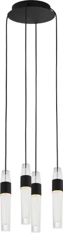 The Lassell 4-light chandelier combines minimalist design with luxurious materials. Laser-etched crystal tubes and natural brass arms create a stunning focal point perfect for contemporary dining rooms and commercial spaces.
