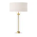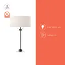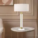 The Sasha table lamp combines clear glass with a metallic stem and white linen drum shade for sophisticated style. Its 18-inch height makes it perfect for bedside tables, desks, and accent surfaces throughout the home.