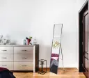 The Alice Floor Mirror combines functionality with contemporary style, featuring a sleek champagne steel frame and beveled edges. Its standout feature is the folding design that collapses to just 2 inches for easy storage.