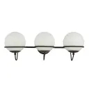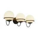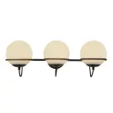 The Alba vanity light blends Italian modern elegance with 1950s playfulness, featuring matte opal glass orbs that appear to float around a minimal matte black frame with aged gold accents. Perfect for bathrooms and hallways.