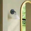 The Halston vanity light brings 1950s couture glamour to contemporary spaces with its glossy opal glass shades and refined matte black finish. Perfect for adding timeless style to bathrooms and powder rooms.